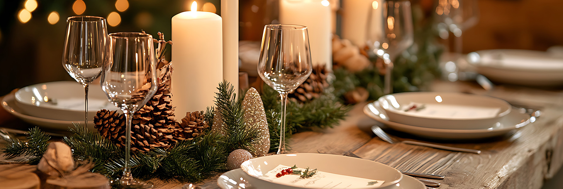 Finally, the design: a tablecloth can feature winter floral motifs, decorations with pine branches, red berries, poinsettias, pine cones, or geometric prints on neutral backgrounds. The important thing is that it harmonizes with the environment and the tableware. The balance between the tablecloth, plates, glasses, and centerpiece is what really makes a table setting look polished.