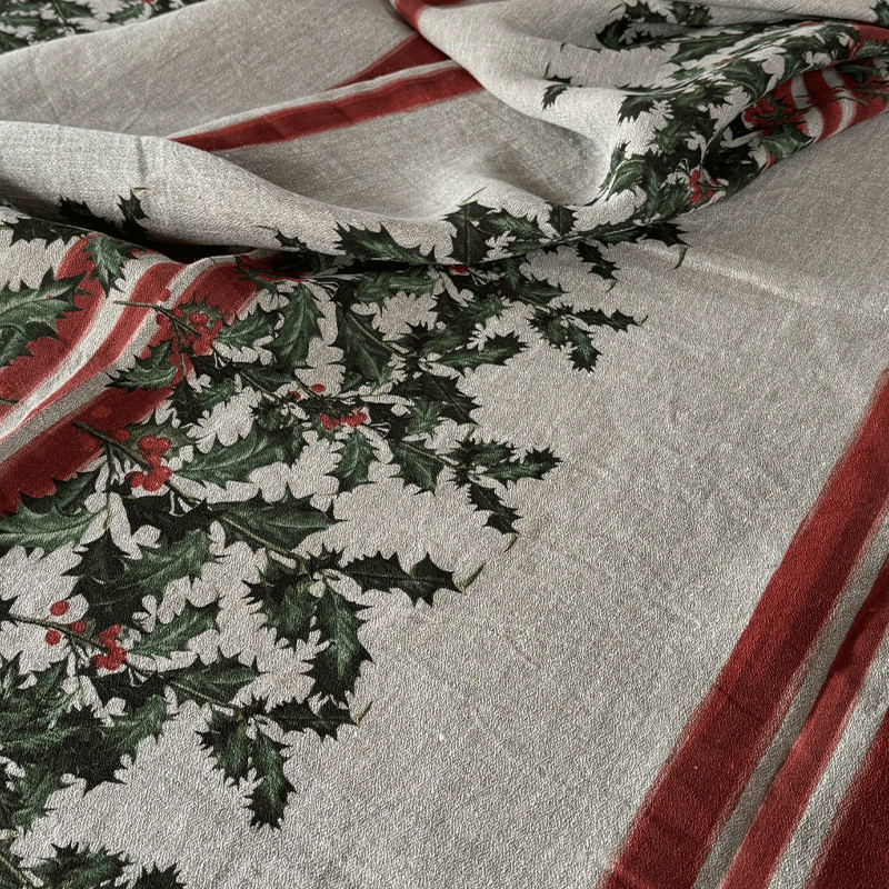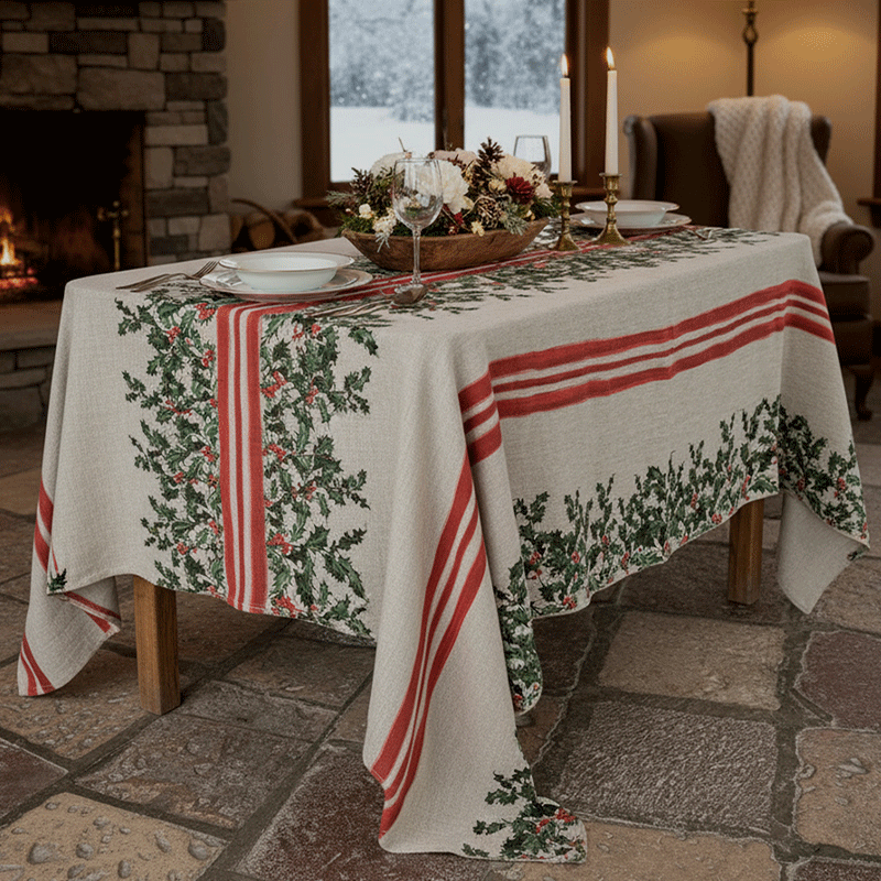 This exquisite Christmas tablecloth, crafted from a fine blend of hemp and natural linen, combines European textile tradition with timeless festive charm. The harmony of natural linen tones with deep red and green creates a perfect balance of rustic elegance and seasonal warmth, making it an ideal centerpiece for your holiday table.