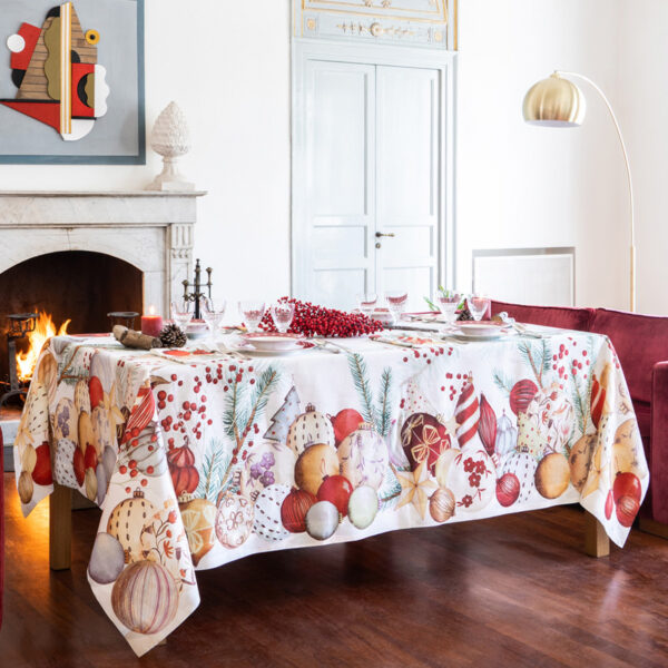 Immerse yourself in the festive atmosphere with our Jingles linen tablecloth embellished with Christmas balls and decorations. Elegance and warmth for the Christmas table. The Jingles linen tablecloth can be combined with napkins in the same designs or with plain linen ones, even mixing colours.