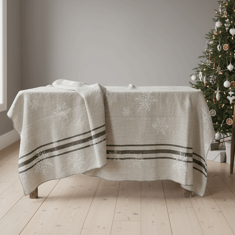 his pure natural linen tablecloth celebrates the quiet beauty of the holiday season with timeless elegance. The soft, textured fabric is adorned with delicate white snowflakes woven into the material, gently resting on the linen background like a winter snowfall.