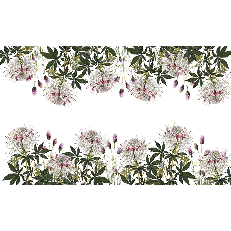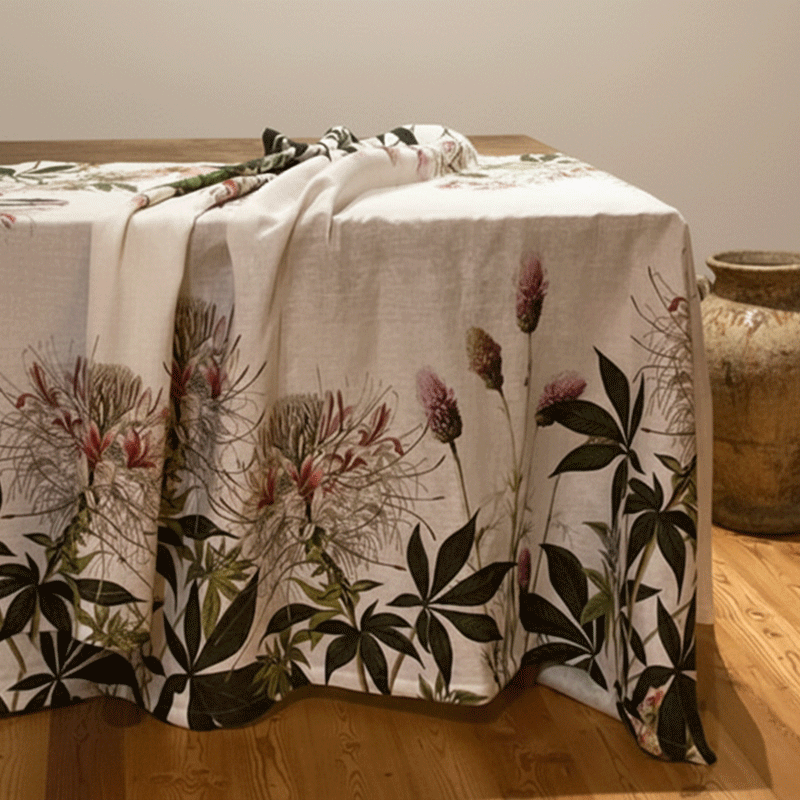 This refined pure linen tablecloth brings the poetry of nature to the table with a delicate botanical motif inspired by wildflowers. Large, softly shaded blossoms, paired with elegantly illustrated leaves, create a harmonious and sophisticated composition on a bright, light background.