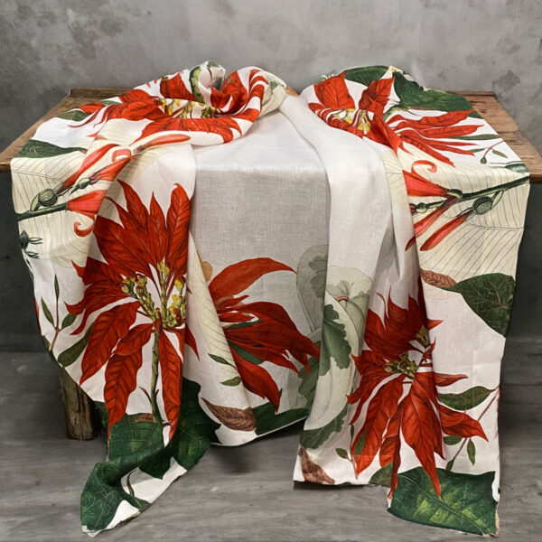 Discover our linen tablecloth with elegant poinsettias: a refined touch for your festive table. Perfect for celebrating Christmas traditions. The Poinsettia linen tablecloth can be combined with napkins in the same designs or with plain linen ones, even mixing colours.