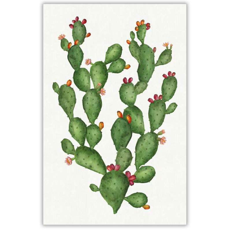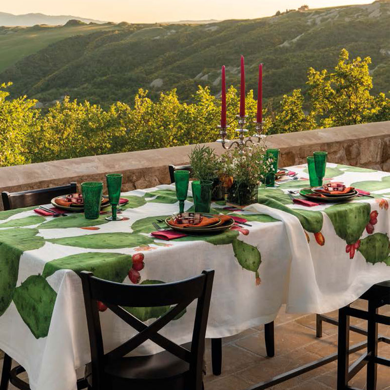 A pure linen tablecloth decorated with an elegant watercolor motif of prickly pear cacti. The fresh and luminous design evokes Mediterranean landscapes, bringing a natural and sunny atmosphere to the table.