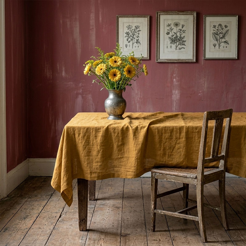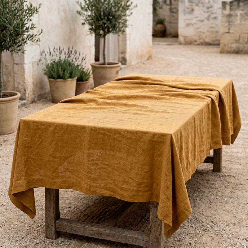 The Linen Tablecloth Vintage Honey Gold is also available in custom sizes.