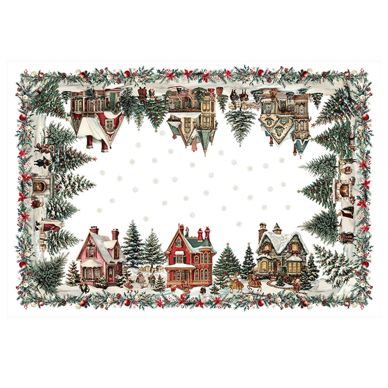 This tablecloth enchants with a beautiful winter scene that evokes the charm of traditional Christmas villages. Along the border, illuminated period houses, snow-covered pines, and delicate festive details create a rich and picturesque frame, while soft snowflakes fall gently across the bright, clean center.