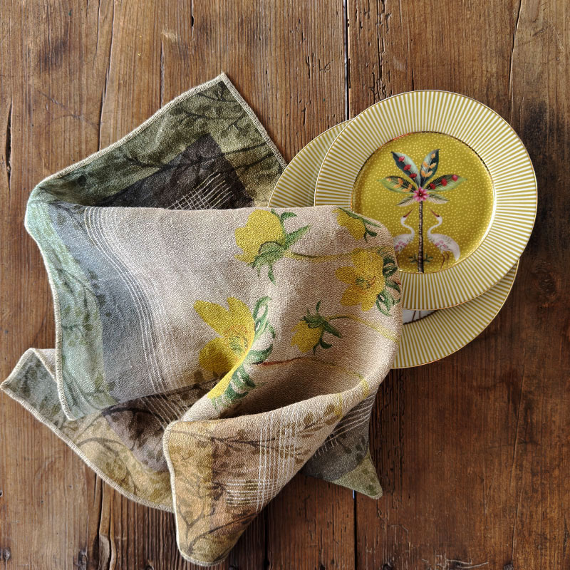 The floral pattern, featuring delicate yellow flowers on soft, warm neutral tones, brings the light and freshness of spring to the table, making any setting feel more inviting and harmonious.