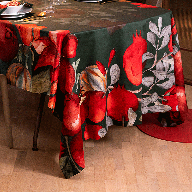 Christmas tablecloth in stain-resistant cotton, decorated with a vibrant pattern of red pomegranates on a deep green background. Both elegant and practical, it brings a warm, festive atmosphere to the table—perfect for Christmas celebrations.