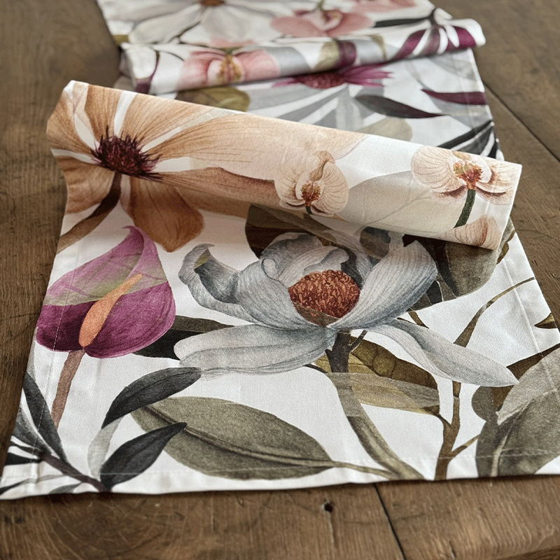 This stain-resistant cotton table runner features an elegant watercolor floral design in shades of pink, cream, and green. Perfect for adding a touch of freshness and refinement to your table, combining style and practicality for any occasion.