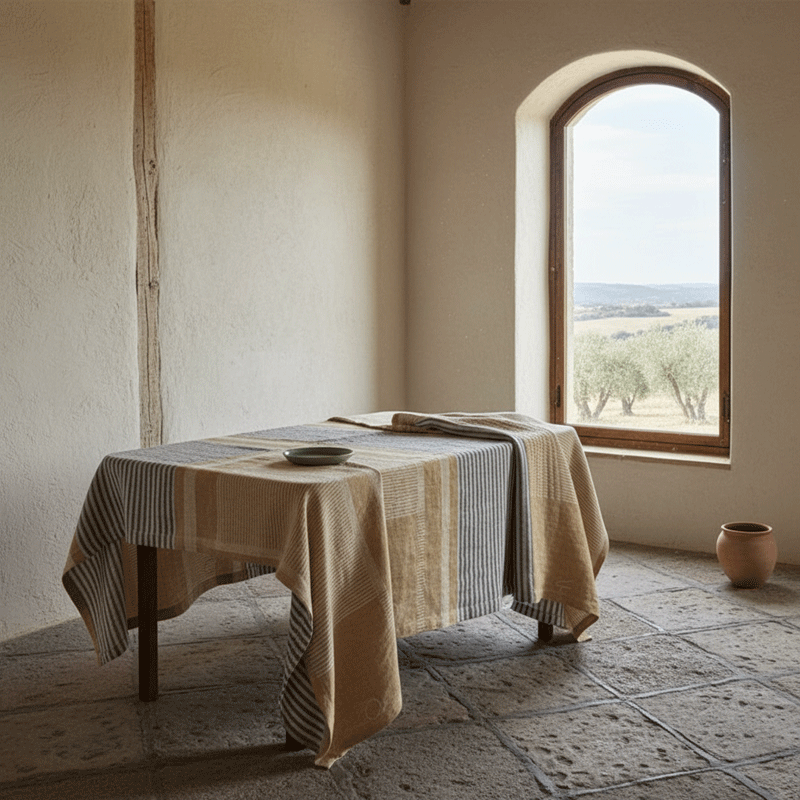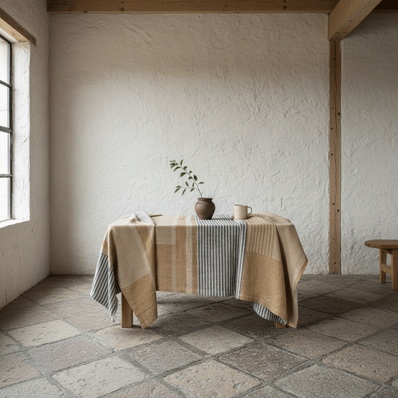 This linen and cotton tablecloth combines the natural elegance of fine fibers with the graphic strength of modernist design. Inspired by the work of Otti Berger, one of the most visionary figures of the Bauhaus school, it reinterprets her study of balance between form, color, and function in a contemporary way.