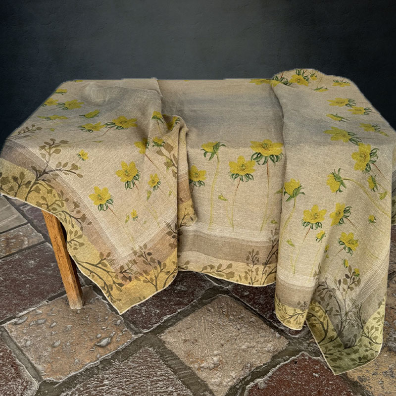 An elegant tablecloth crafted from a precious blend of hemp and linen, natural and durable, designed for those who appreciate the authentic beauty of artisanal fabrics. The floral design, with delicate yellow flowers on a neutral background, brings freshness and brightness to the table, creating a warm and refined atmosphere.