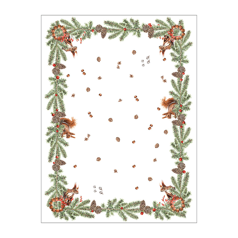 This linen tea towel features a delicate border of pine branches, cones, and red berries, brought to life by playful squirrels and tiny footprints in the center.