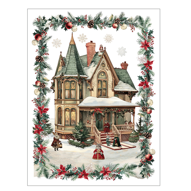 This tea towel features a charming Victorian house nestled in a snowy landscape, framed by detailed Christmas decorations. A festive accessory that brings the magic of the holidays into your kitchen.